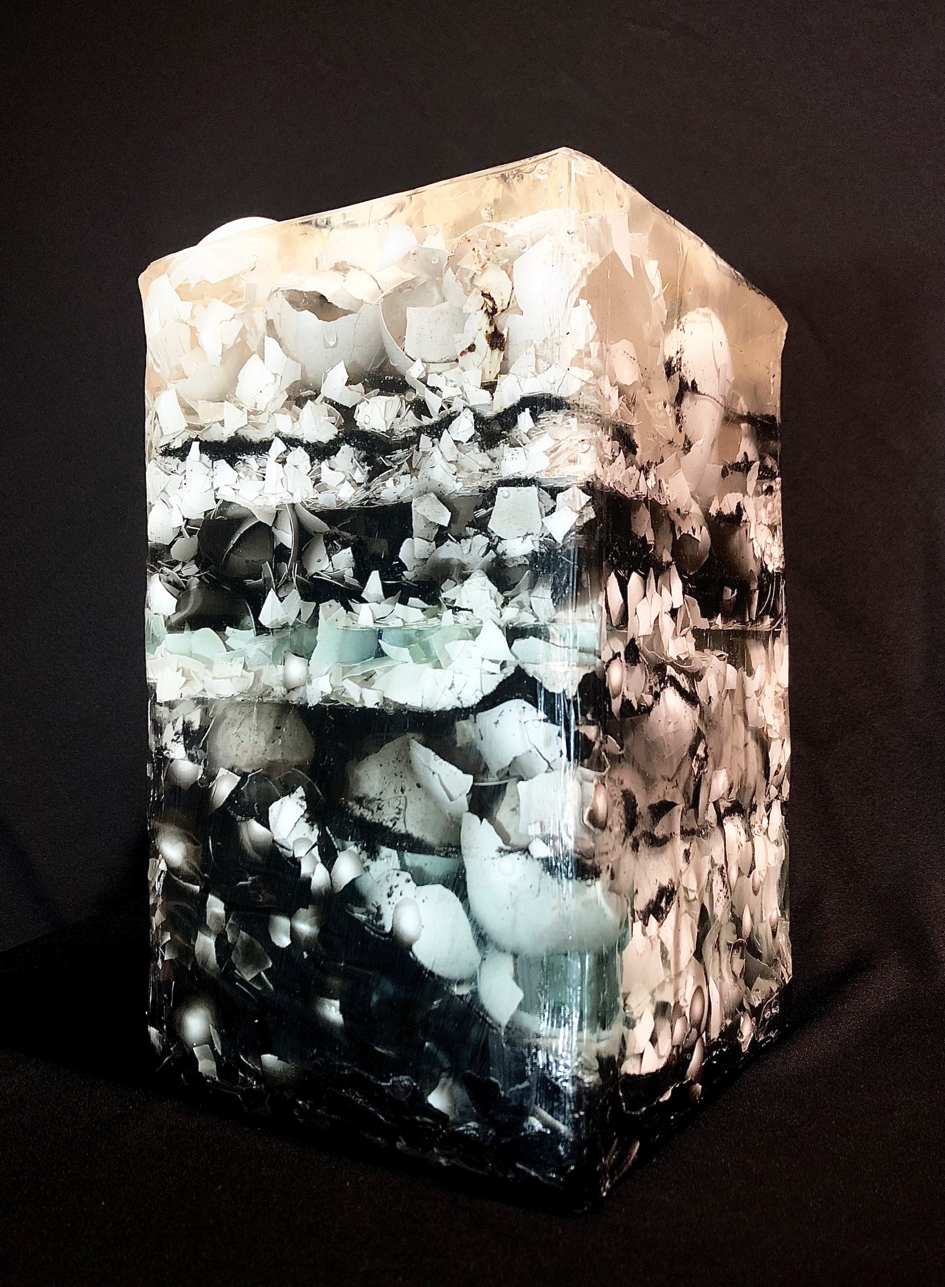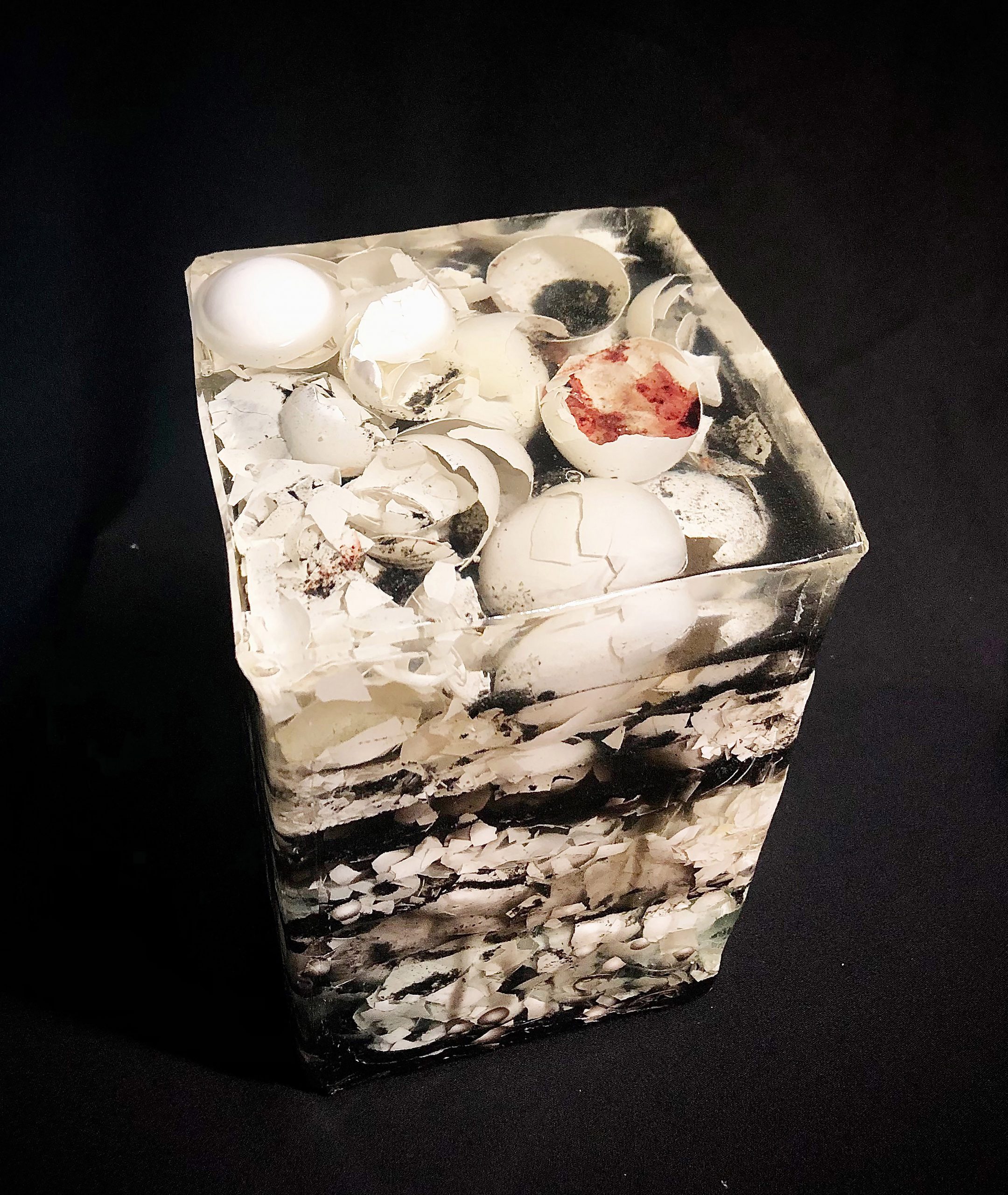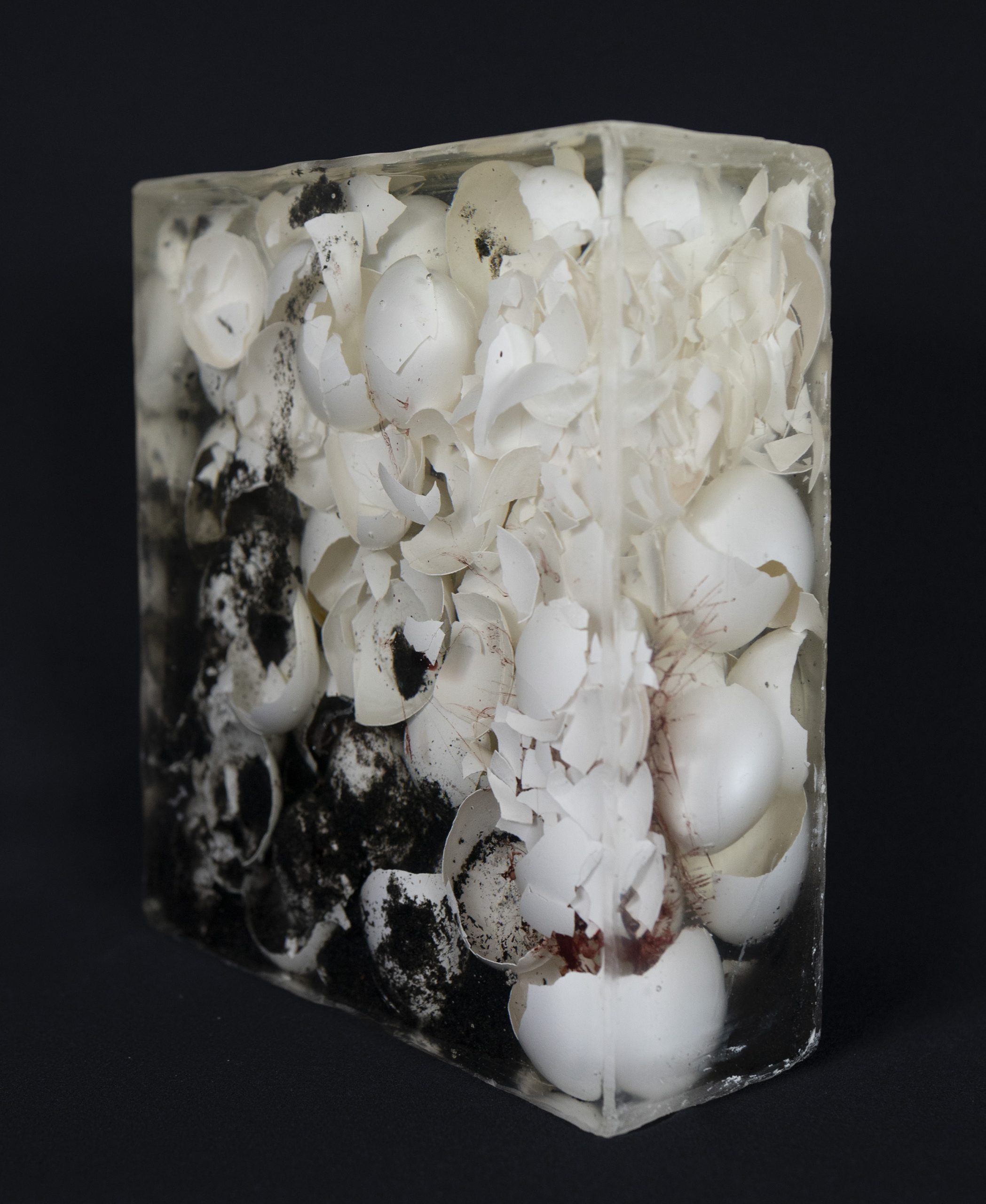 SEDIMENTE IV / 2022 / Epoxidharz, Eierschalen, Asche, Blut (B+) / 20 x 40 x 20 cm