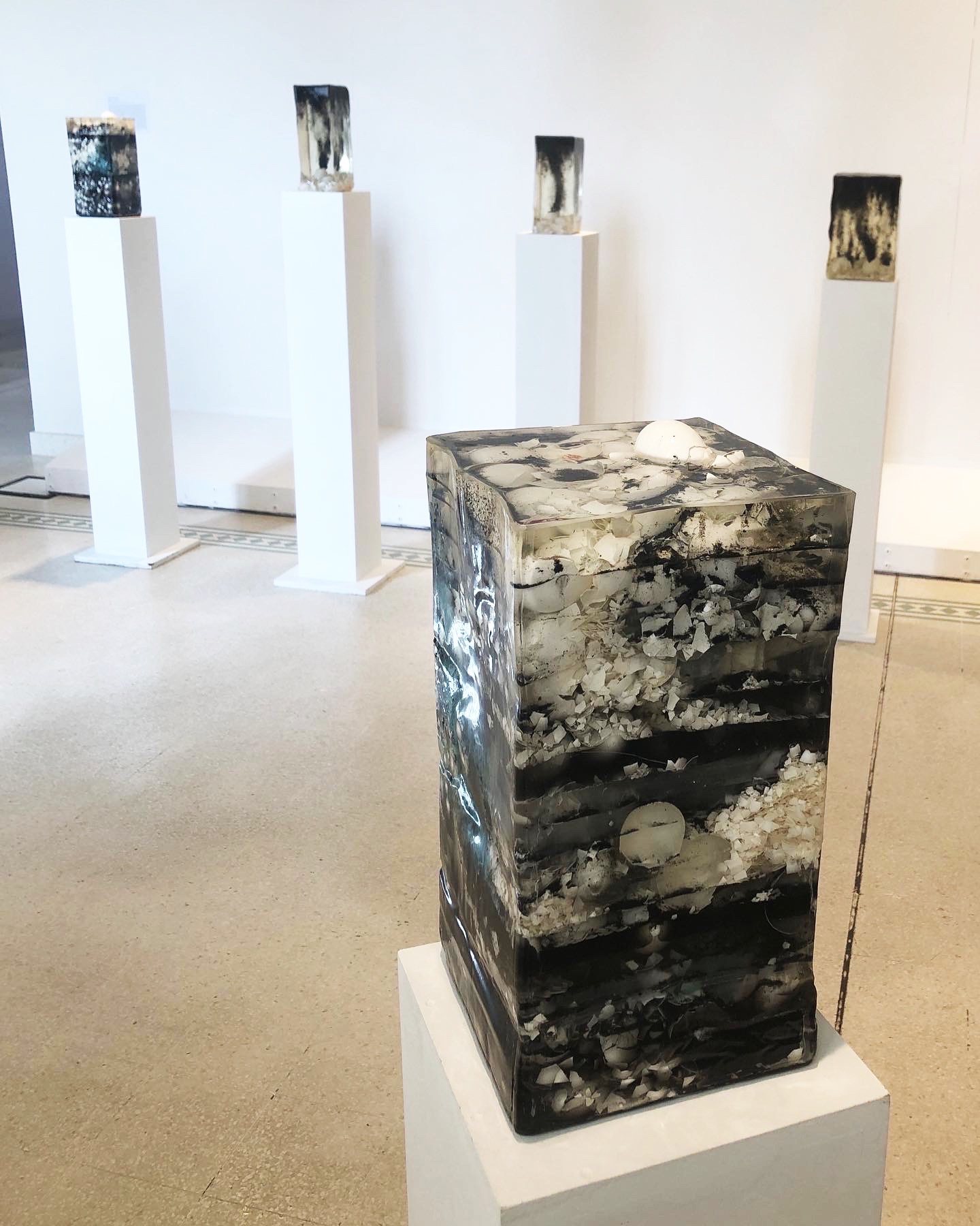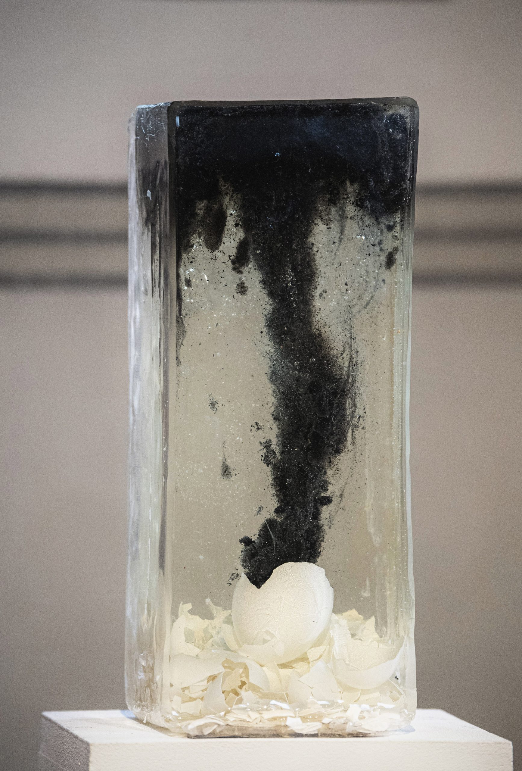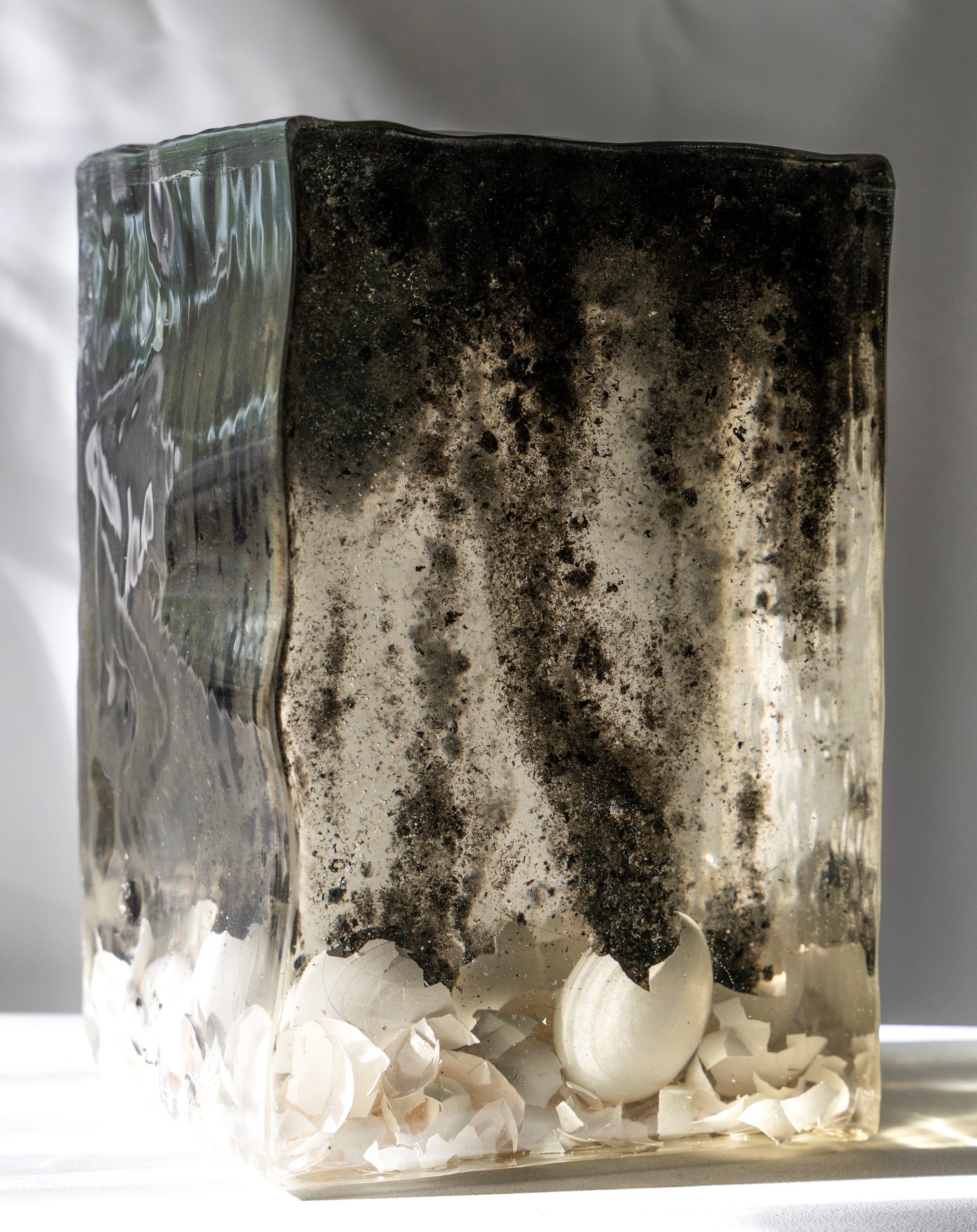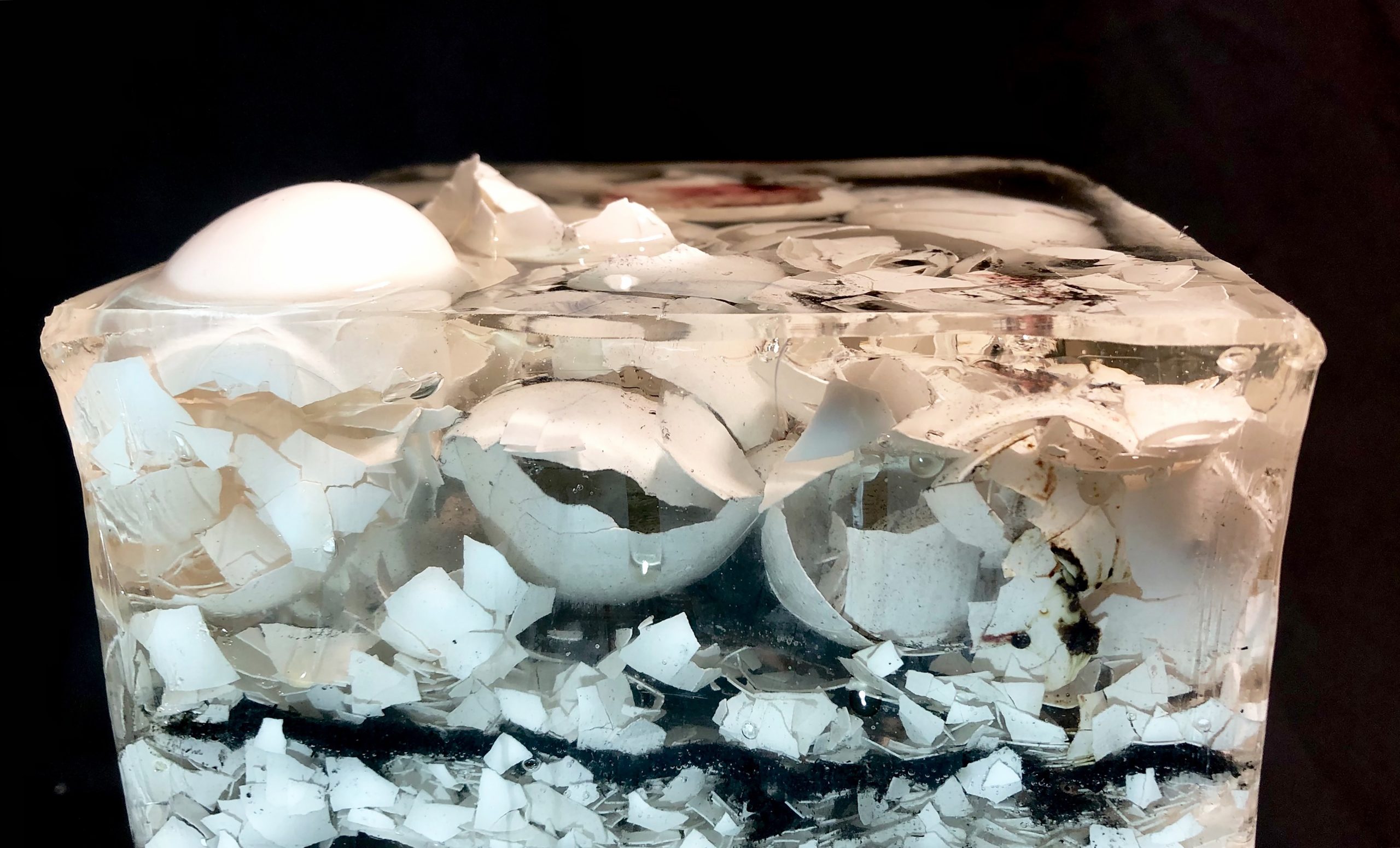 SEDIMENTE IV / 2022 / Epoxidharz, Eierschalen, Asche, Blut (B+) / 20 x 40 x 20 cm