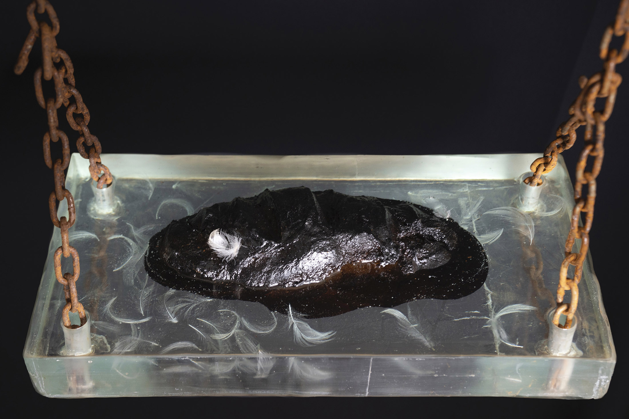 DAS SCHWARZE BROT / DIE SCHAUKEL ( Detail ) / 2020 / Weizenbrot (verkohlt), Federn, Epoxidharz, Eisenkette /
