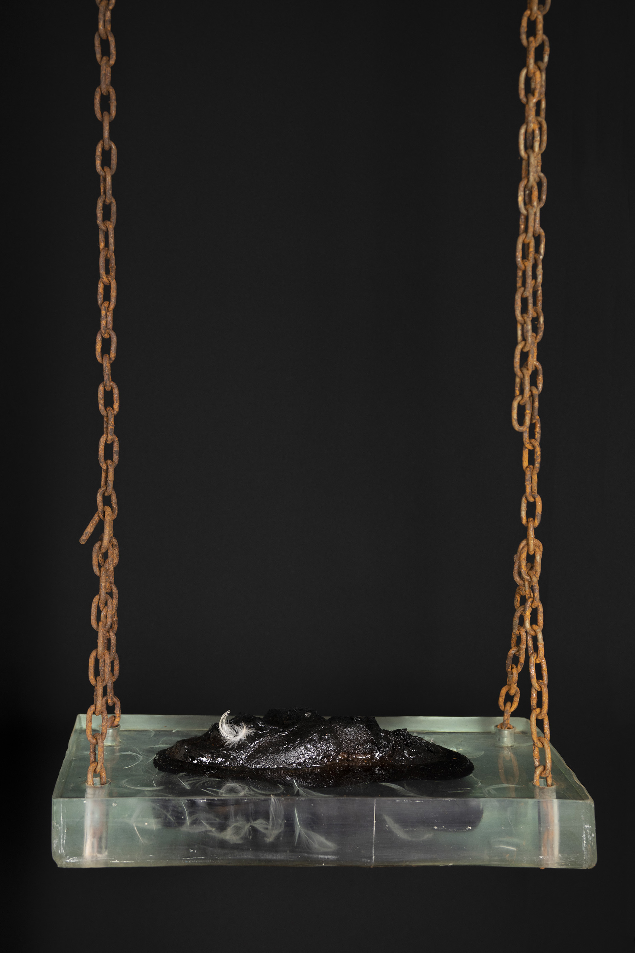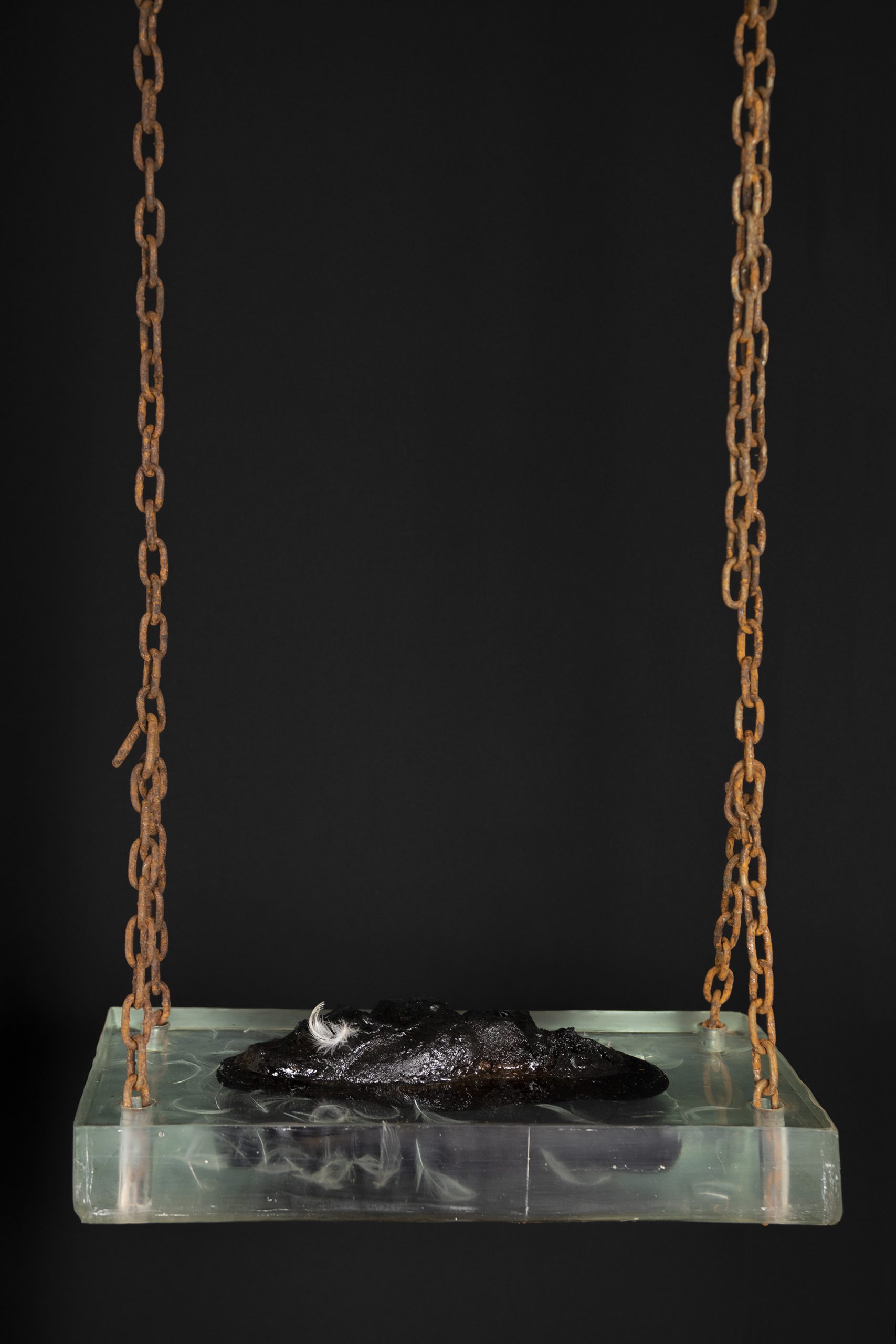 DAS SCHWARZE BROT / DIE SCHAUKEL / 2020 / Weizenbrot (verkohlt), Federn, Epoxidharz, Eisenkette /