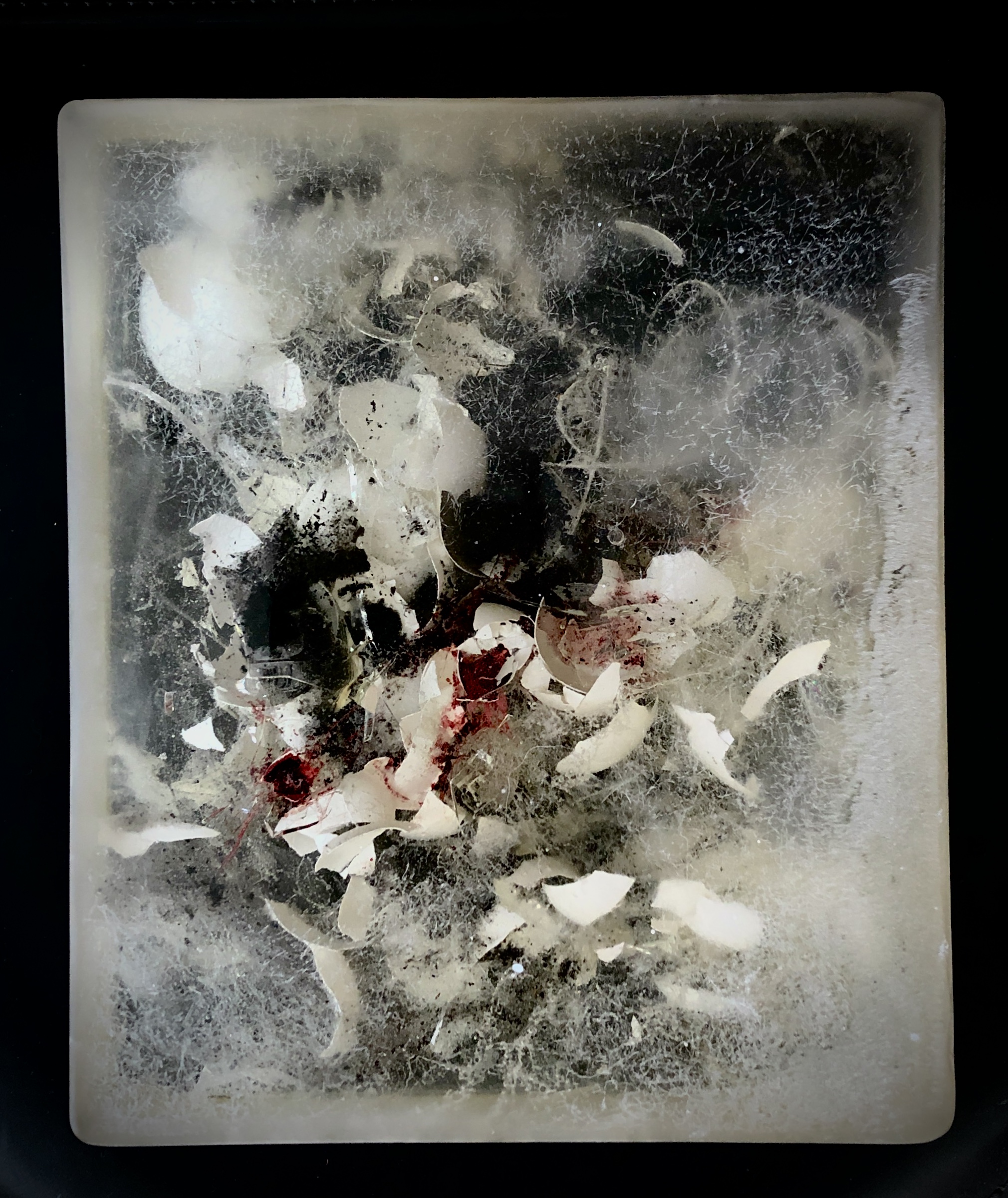 POSTSCRIPTUMFUGE No.5 / 2021 / Epoxidharz, Eierschalen, Asche, Blut (B+), Baumwolle / 22 x 26 x 6 cm
