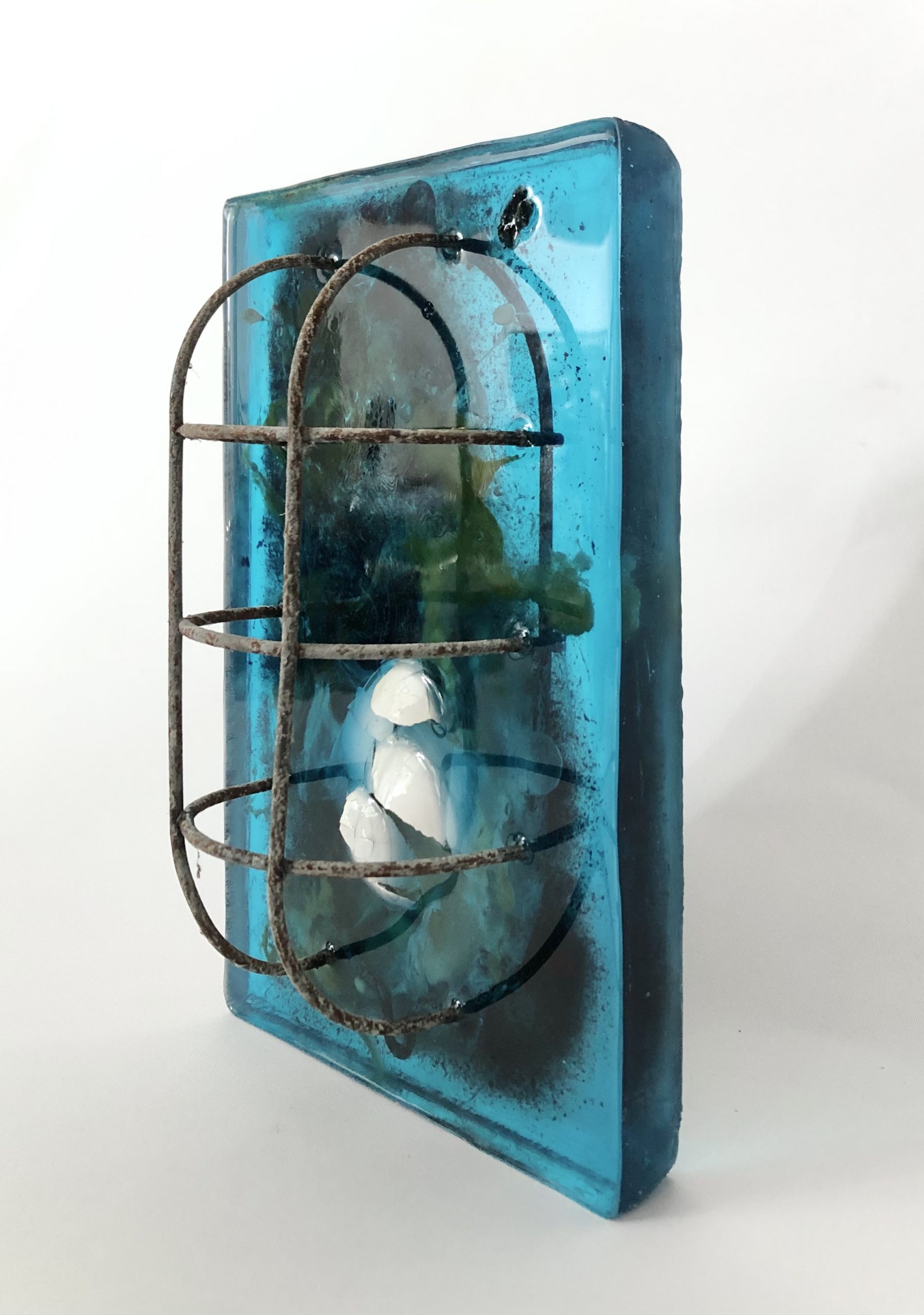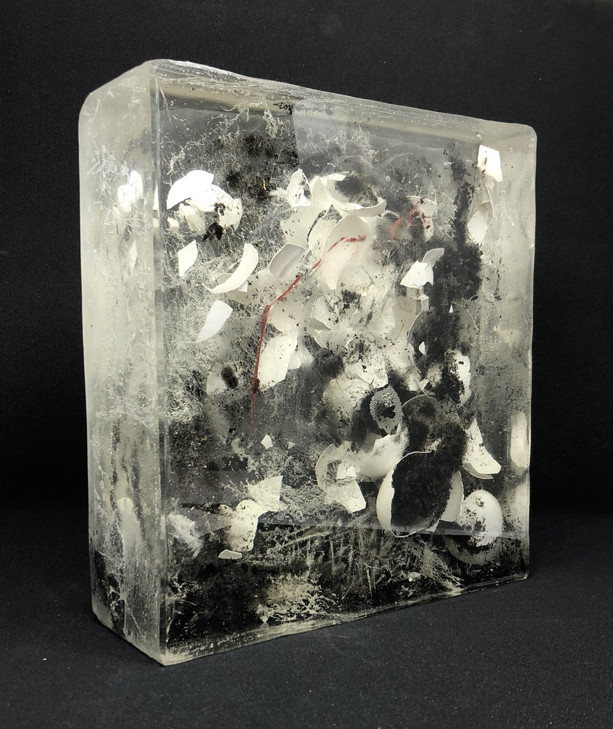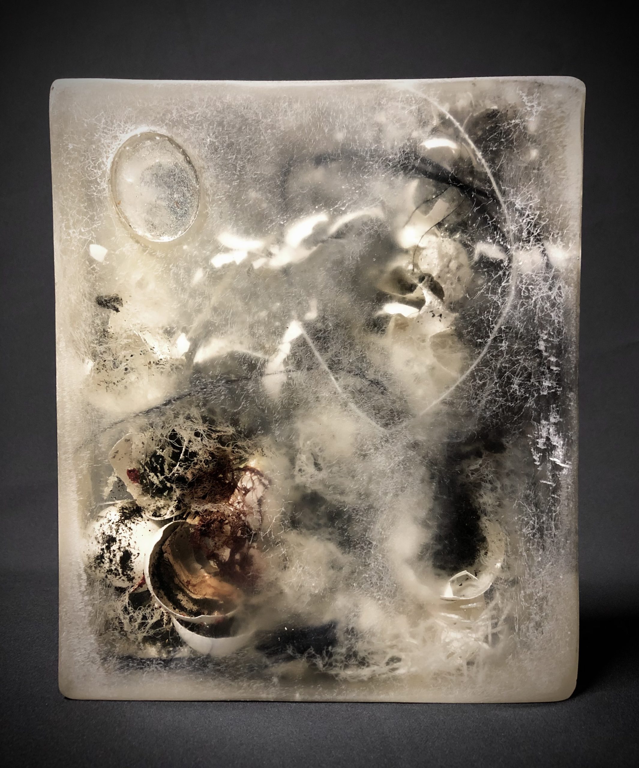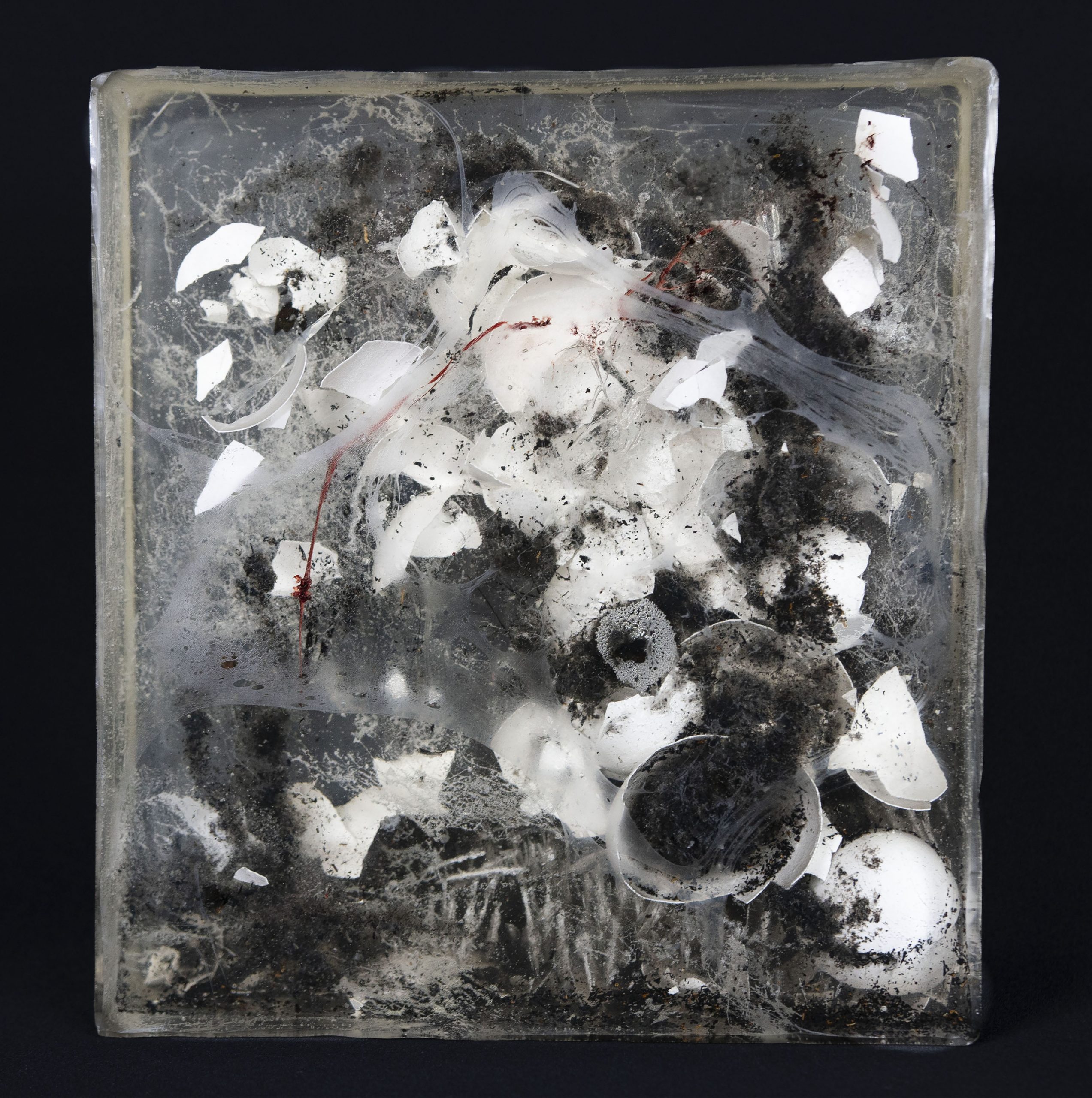 POSTSCRIPTUMFUGE No.4 / 2021 / Epoxidharz, Eierschale, Asche, Faden, Blut (B+) / 22x26x7 cm