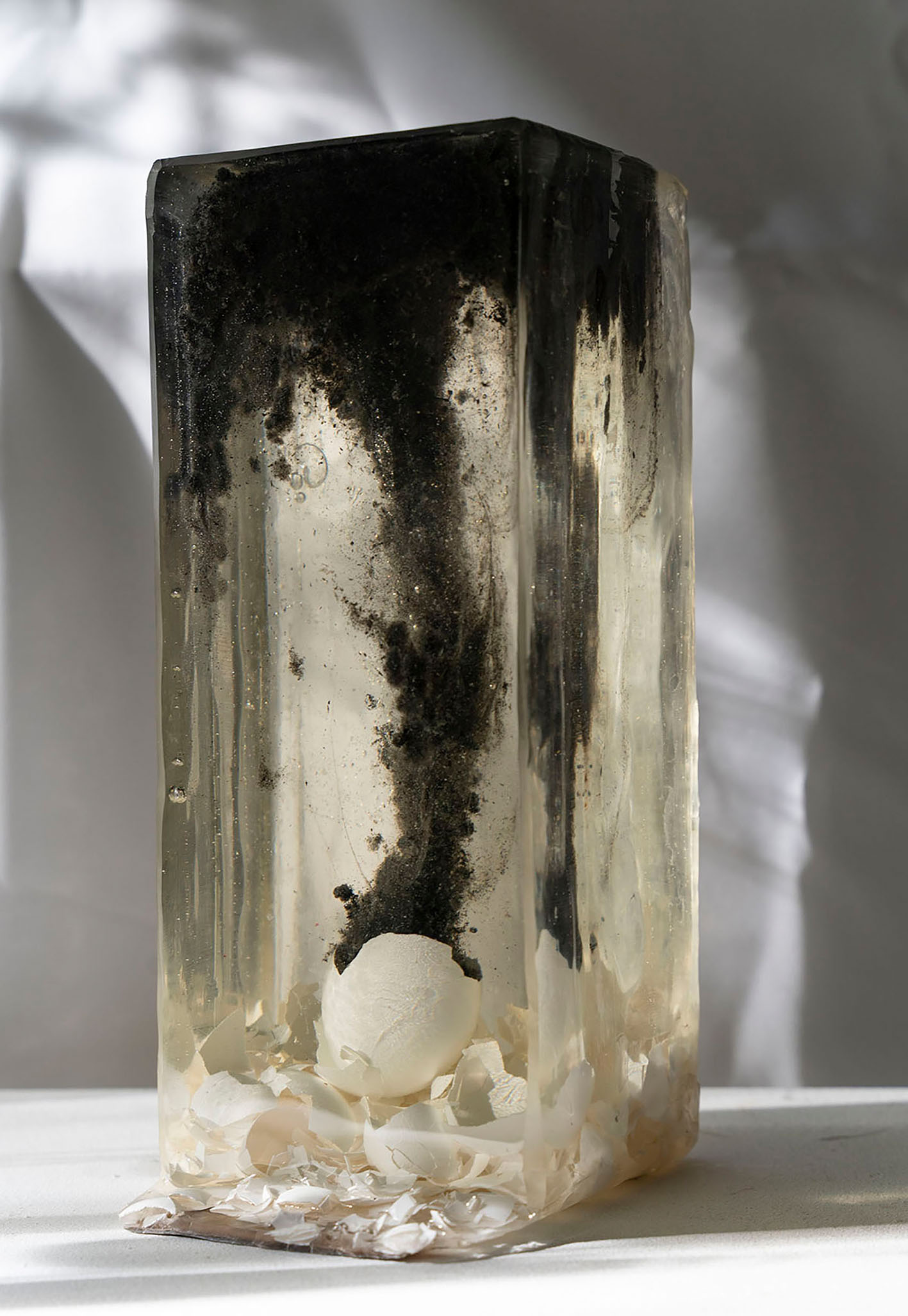 SEDIMENTE III / Epoxidharz, Eierschalen, Asche, Blut (B+) / 14 x 29 x 14 cm